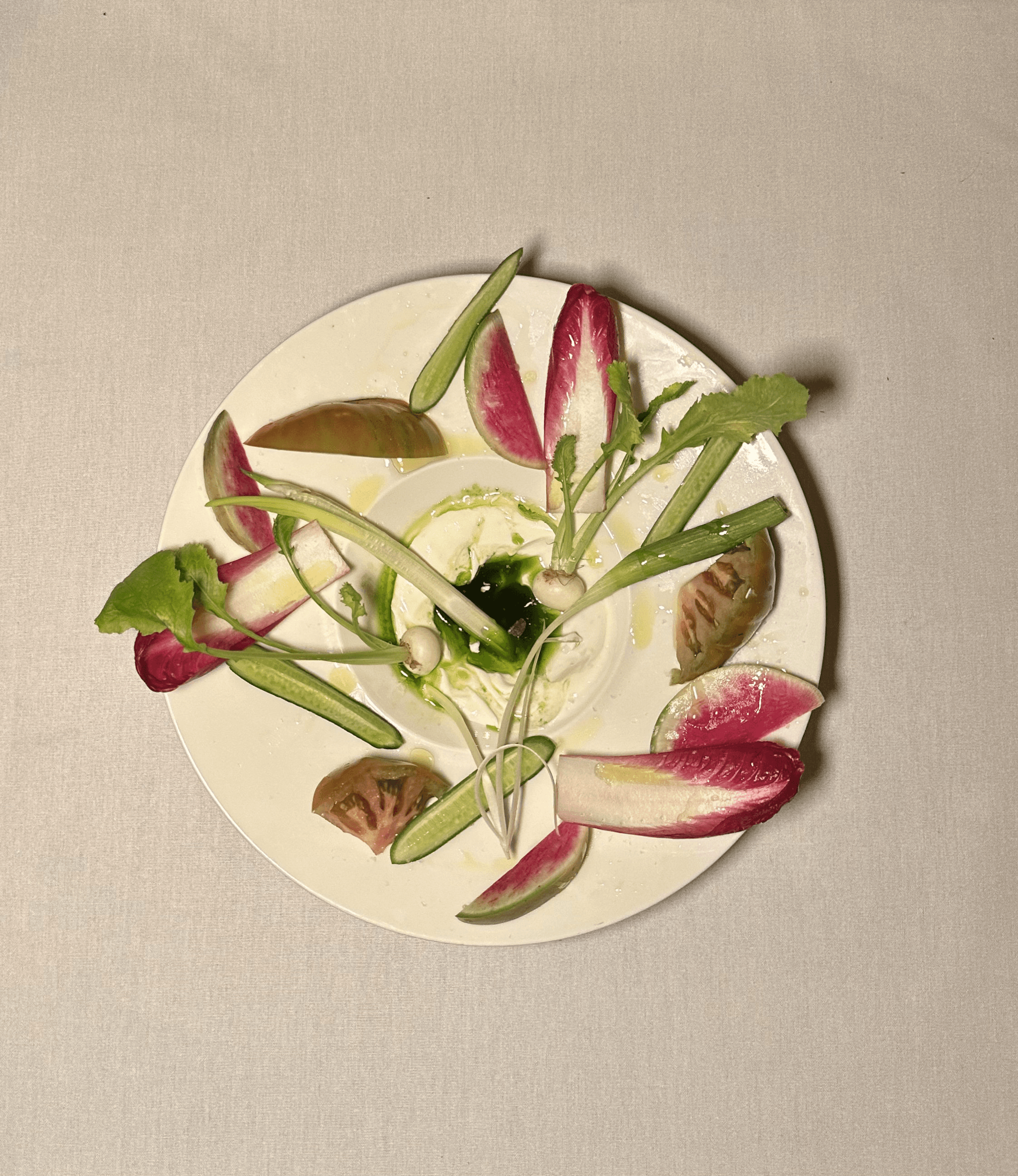 משחק של טקסטורות וצבעים.ירקות שדה חתוכים גס לצד מטבל יוגורט כבשים ושמן זעתר.מנה שמנקה את החך ומכינה את הגוף לקצב הגבוה.
