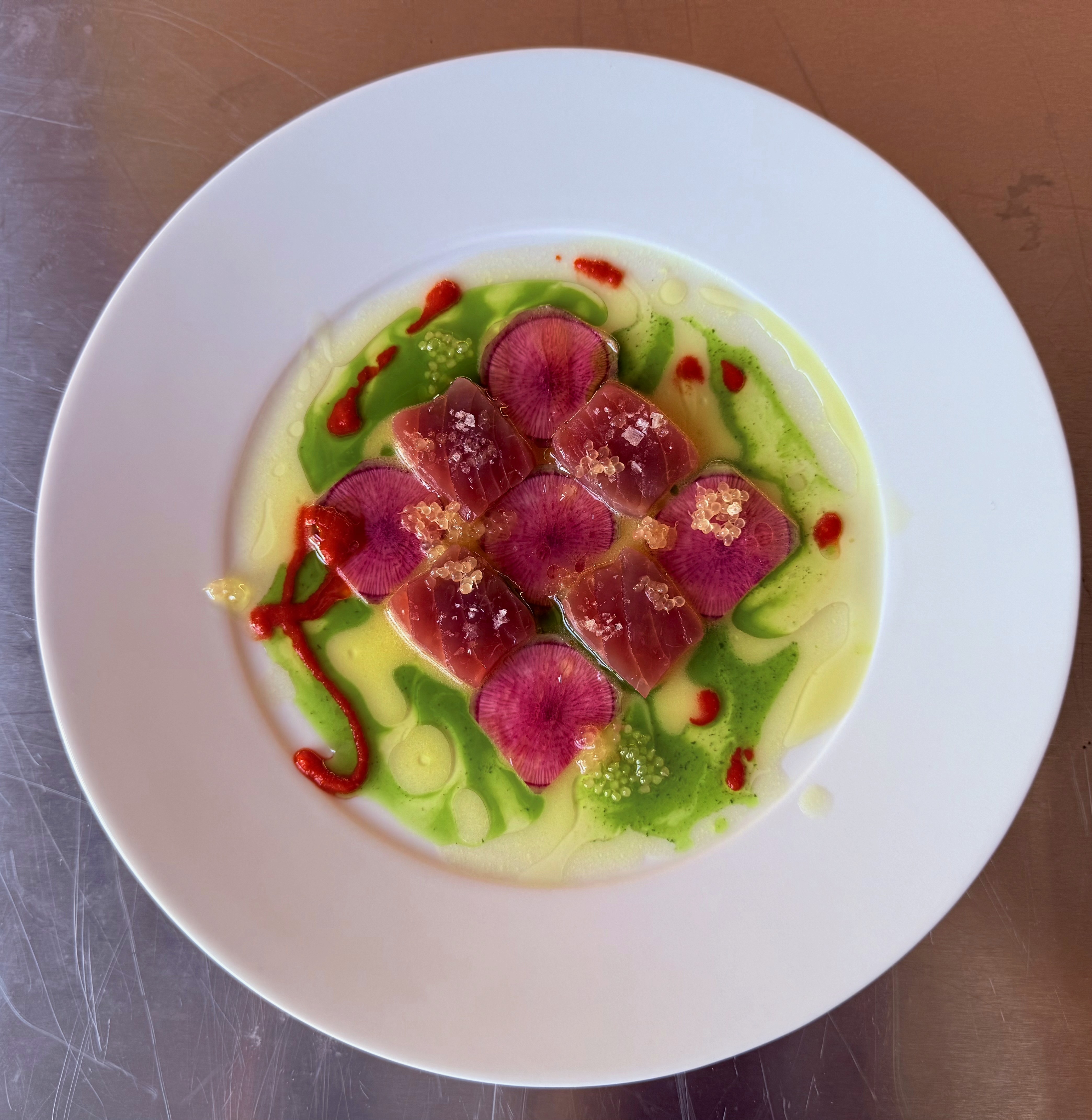סאונד נקי וצלול בצלחת. דג נא בטריות שיא, משחק עם הקראנץ' של הצנונית והחמיצות החשמלית של הליים. הכל יושב על 'רצועה' של שמן עשבים ירוק וויניגרט הדרים. ביס עם גבוהים חזקים.